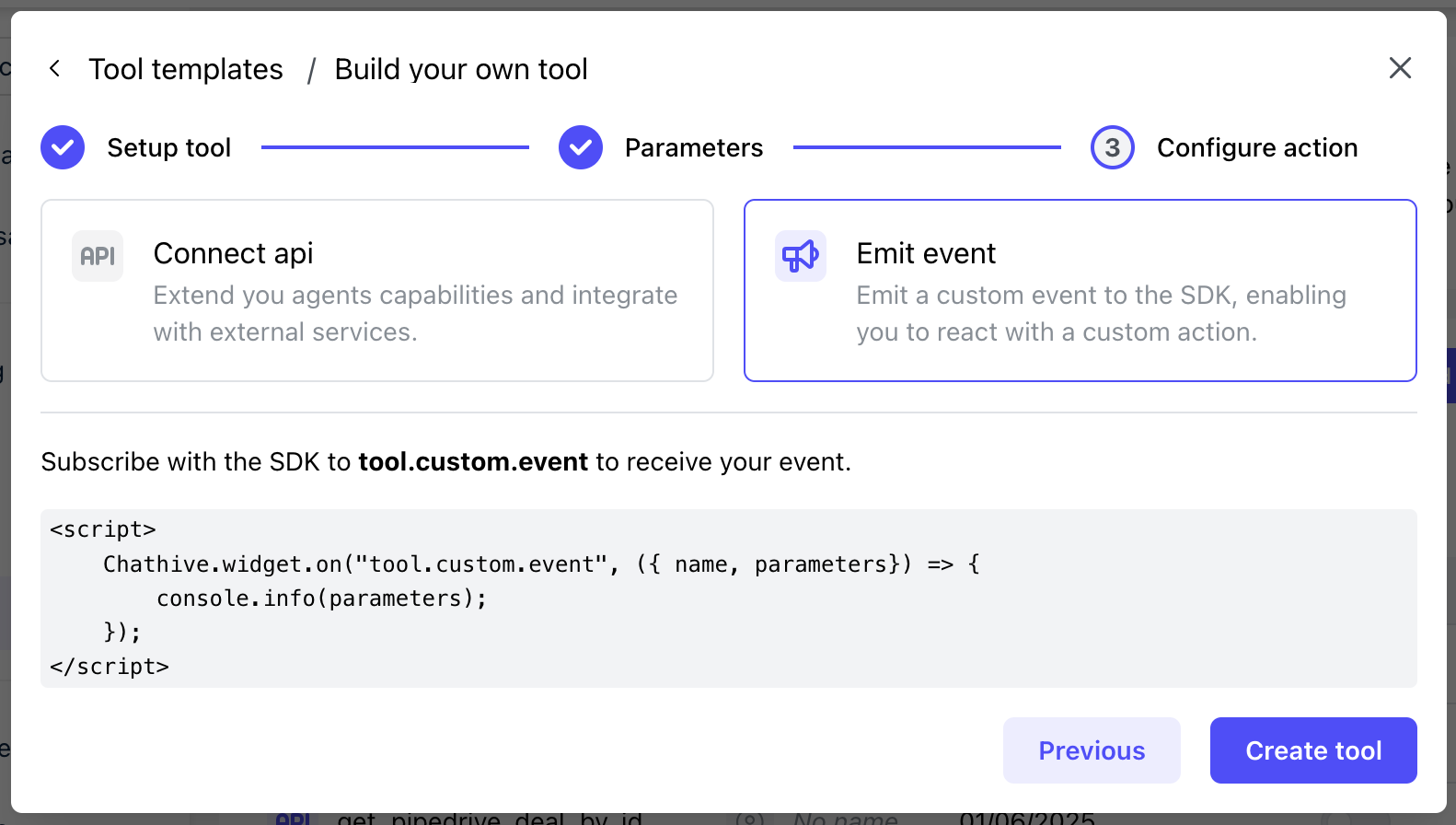 Chathive.widget.on("tool.custom.event", ({ name, parameters }) => {