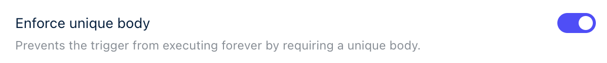 To prevent executing the same trigger multiple times and waisting AI credits, you can enforce it to only execute triggers with a unique body. Once this is turned on, every trigger that is executed with the same body will be dropped. This will only check triggers that are executed with a body.